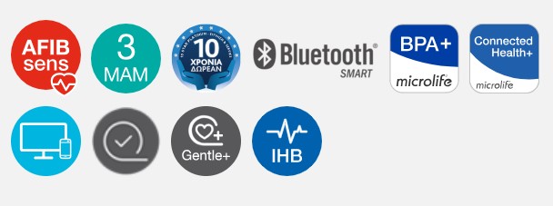 • Τεχνολογία IHB: αναλύει τη συχνότητα παλμών και ανιχνεύει ακανόνιστο καρδιακό ρυθμό κατά τη μέτρηση της αρτηριακής πίεσης.