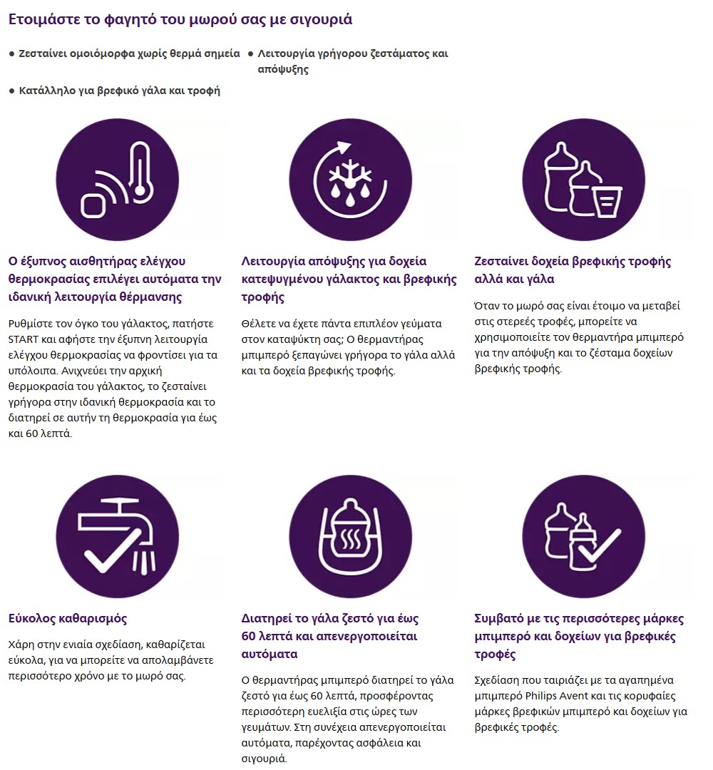 Ζεστάνετε βρεφικές τροφές μέσα σε λίγα λεπτά με έναν θερμαντήρα μπιμπερό που διαχειρίζεται τη θερμοκρασία για εσάς. Ο έξυπνος αισθητήρας ελέγχου θερμοκρασίας ρυθμίζει αυτόματα το πρόγραμμα θέρμανσης για γρήγορο και ομοιόμορφο ζέσταμα.